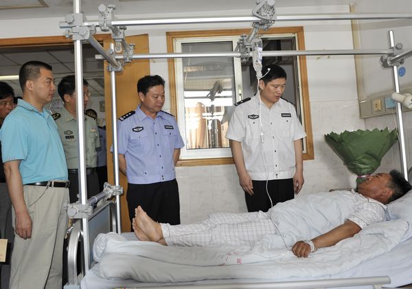 7月30日上午,市公安局徐乾副局長在交巡警支隊蘇必偉支隊長和公司婁伯翱總經理等領導的陪同下,到八二醫院看望慰問了因公負傷的我公司保安四大隊交通協管員孫長如,并送上了慰問金。(有關事跡本網將繼續關注并發布)