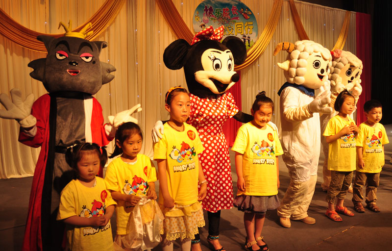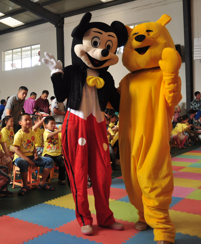 下午兩點,活動中心內,播放著一首首兒童歌曲,卡通人物喜羊羊、美羊羊、紅太郎、灰太狼、維尼小熊等在場內和孩子們愉快的做著小游戲。每個到場的孩子憑著入場券在場內領取了一件黃色的卡通T恤衫,還有食品和飲料。