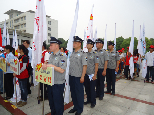早上8:30左右 , 隊員們統一制服,帶上隊旗和隊牌,在師范學院王營校區生物科學館前廣場前參加環保知識的宣傳活動。隊員們紛紛表示,保護環境,與我們的生活息息相關,從身邊小事做起,將切實落實到保安的實際工作中去。作為青年志愿者,將呼吁身邊更多的人用實際行動,共同為保護洪澤湖、保護環境而盡心盡力,為努力營造一個優美的人居環境而努力。