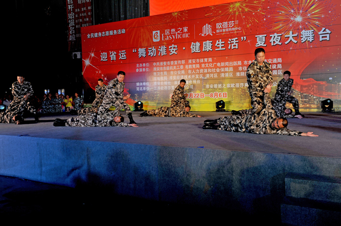 7月30日晚,淮安市公安局在體育館廣場(chǎng)舉辦“舞動(dòng)淮安·健康生活”夏夜大舞臺(tái)市民健身活動(dòng)公安專場(chǎng)演出。活動(dòng)在激昂的鼓韻聲中拉開帷幕。總公司的精彩的擒敵表演、開場(chǎng)舞以及《當(dāng)祖國(guó)召喚》等節(jié)目參加活動(dòng),贏得了現(xiàn)場(chǎng)市民的陣陣掌聲。活動(dòng)中還進(jìn)行了省十八屆運(yùn)動(dòng)會(huì)和健康生活知識(shí)有獎(jiǎng)問答。市局黨委委員、機(jī)關(guān)黨委書記蘇必偉、總公司總經(jīng)理婁伯翱等領(lǐng)導(dǎo)在現(xiàn)場(chǎng)觀看了演出。市交巡警支隊(duì)、特警支隊(duì)、總公司人防中心等100余人參加活動(dòng)。