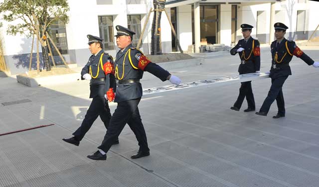 雖然室外氣溫格外寒冷,但這里卻充滿了春天的氣息。上午9時50分,4名禮儀保安抬著一塊披著紅綢的標牌, 邁著整齊的步伐走向公司大門,9時58分,江蘇省淮安市保安服務總公司標牌緩緩地、平穩地掛了起來,現場響起陣陣鞭炮聲和熱烈的掌聲,大家共同為總公司新址掛牌而歡欣鼓舞。