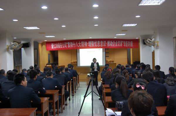 本網-福建省晉江市保安服務公司消息(通訊員 歐陽長青) 為進一步適應日益激烈的市場競爭,切實推動企業持續發展,3月27日-28日,公司結合“增強憂患意識,推動長遠發展”大討論活動,舉辦“貫徹黨的十八大精神·增強憂患意識,推動企業發展”專題講座。晉江市委黨校副教授吳蓮妹應邀前來授課。保安公司領導吳輝表、各部門經理、工作人員等100多人聆聽了講座。