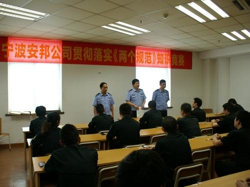 為全面推動寧波安邦護衛有限公司學習省安邦護衛有限公司《兩個規范》活動向縱深發展,進一步營造全員參與的濃厚氛圍。2012年5月12日,寧波安邦護衛有限公司組織開展“貫徹落實《兩個規范》知識競賽”活動。公司10支代表隊共49名選手參加了角逐,公司張正逸總經理、董國平副總經理到競賽現場巡考。