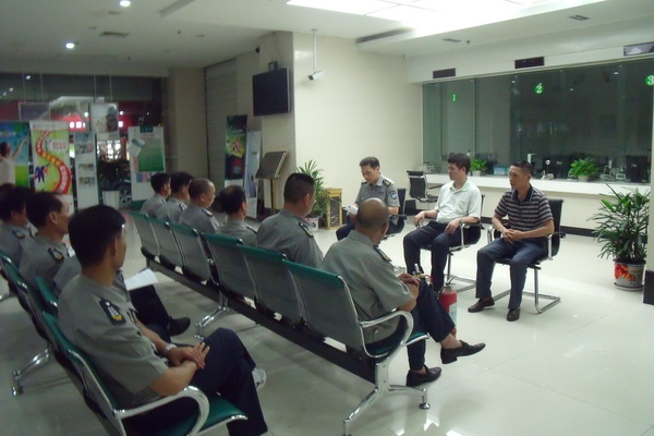 (上圖)為了組織好此次專項銀行突發事件應急演練的消防安全演練,黃瑞明科長和林銘春中隊長以實例向保安員講解應對犯罪嫌疑犯人在營業廳實施搶劫暴力侵害時,要以“平息事態、控制局面、防止擴大散、減少損失”為主要原則,針對不同情況采取制止、保護、求援、疏散等方法,確保銀行營業場所的安全,并對消防安全“四個能力”建設、火災基礎知識、高層建筑逃生自救、辦公樓常用消防設施的檢查、使用等多個方面進行對保安員詳細講解培訓。
