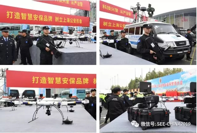 上海保安集團警盾無人機團隊亮相誓師大會現(xiàn)場,展示新型科研設(shè)備。