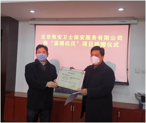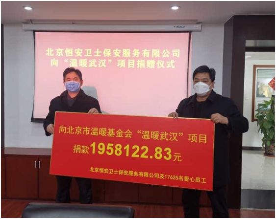 2020年3月9日,北京恒安衛士保安服務有限公司將企業和17625名愛心員工共計1958122.83元的善款捐贈至北京市溫暖基金會,通過溫暖基金會表達對武漢市抗疫一線醫務工作者、公安干警和保安兄弟的崇高敬意。