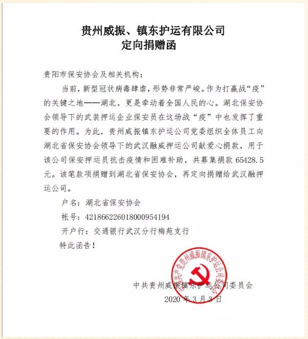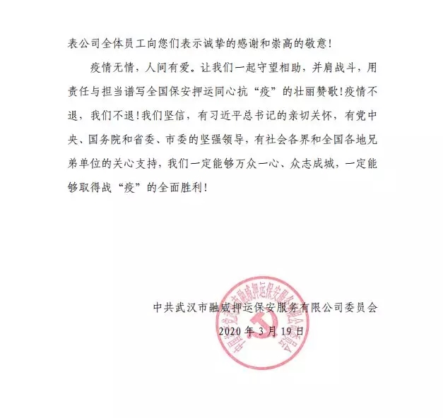 近日,貴州威振鎮東護運公司黨委動員組織廣大員工,積極為我公司募捐愛心捐款,用于疫情防控和慰問抗疫一線員工,并經多方協調,將捐贈專項款項送達到我公司。在武漢市疫情防控工作進入決勝階段,貴州威振鎮東護衛公司的愛心,為我們打贏疫情防控阻擊戰匯聚了強大的精神力量,必將進一步增強一線隊員的堅定決心和必勝信心。武漢市融威押運公司黨委及全體員工對貴州威振鎮東護運公司黨委和全體員工,以及提供協調支持的貴陽市保安協會、湖北省保安協會和武漢市保安協會等機構,表示誠摯的感謝和崇高的敬意!