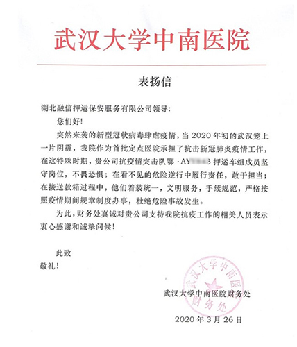 近日,廣電運通下屬成員企業湖北融信收到了一封來自武漢大學中南醫院的表揚信,信中對湖北融信中南醫院服務車組在疫情期間堅守崗位、不畏恐懼、敢于擔當、文明服務的工作表現給予了充分肯定與表揚,并對湖北融信給予醫院抗疫工作的支持與幫助表示衷心感謝。