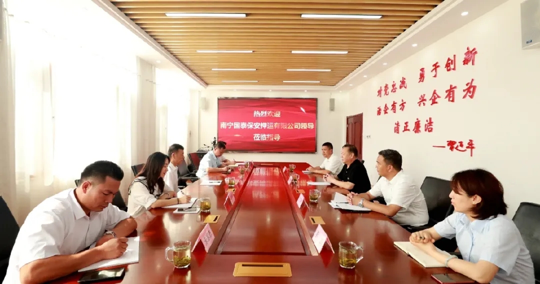7月8日,南寧國泰保安押運有限公司總經理羅來明、副總經理趙佩翔等一行5人到山東泰山保安服務有限公司進行考察交流。泰山保安總經理王鐵鋒、副總經理丁國民陪同調研并進行座談交流。