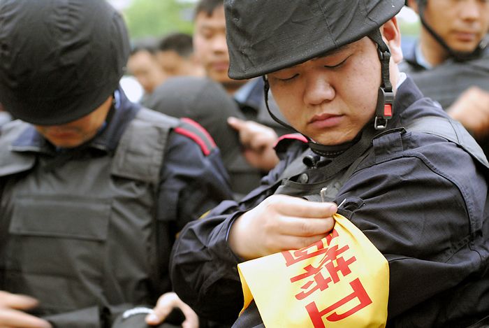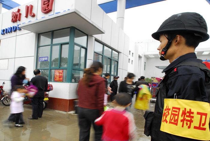 2010年5月5日早晨6時許,全副武裝的校園特衛(wèi)人員整裝待發(fā)。自當日起,江蘇省淮安市首批46名配備鋼盔、防刺服、防割手套、防暴膠棒、滅火槍、催淚器等防護裝備的專職校園特衛(wèi)人員開始進駐市直23所中小學和幼兒園,守護校園平安。這些人員都是從全市保安隊伍中精選出來的骨干,年齡在35歲以下,大都有部隊服役的經(jīng)歷,身體素質(zhì)和政治素質(zhì)較好,且受過專業(yè)訓練。