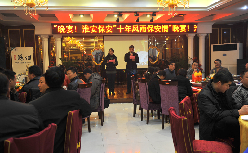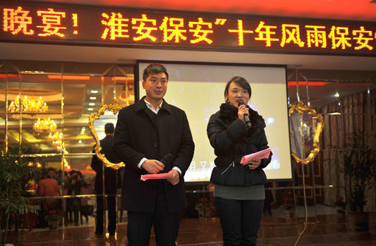 19:18分,晚宴準時開始!首先是在公司工作了20幾年的財務部李萬晴和消防分公司周鵬上臺講述了自己二十幾年的保安情。講述了曾經公司由一窮二白經過努力到今天多元化的發展。緊接著是曾經在公司工作過但現在離開的趙長林講述了自己從工作到離開和淮安保安一段難忘的經歷。后來,黨委副書記吳淮甫、副總經理王克分別上臺講話。最后婁總上臺發表了熱情洋溢的致辭,感染了在場的每一名員工。婁總對淮安保安未來的發展充滿信心,也表達了堅定的決心。