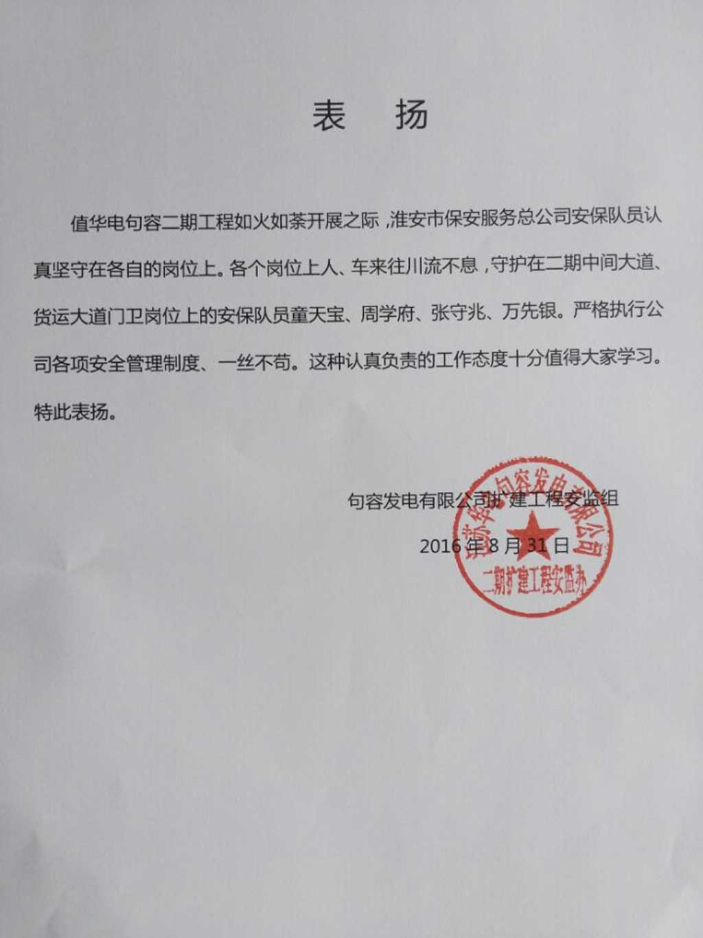 2016年8月31日,淮安保安駐外分公司收到江蘇華電句容發電有限公司發來的表揚信。表揚淮安保安駐句容執勤點的四名保安隊員童天保、周學府、張守兆、萬先銀認真堅守各自崗位、嚴格執行服務單位各項安全管理的行為。
