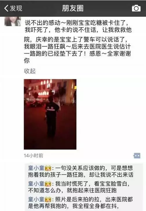 這個就是那條求助信息,照片中一名特勤隊員緊緊的抱著一個孩子。發布人童女士對照片描述大意是:孩子被糖果卡住了情況危急,情急之下一名巡邏的特勤隊員抱起孩子第一時間趕到了醫院,孩子轉危為安。她很希望找到這個好心的特勤隊員。
