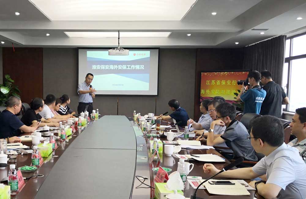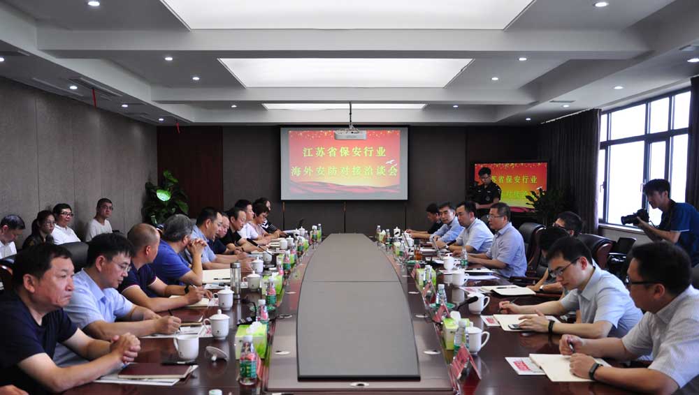 2018年8月7日上午,江蘇省保安協會邀請江蘇省商務廳、江蘇海外企業集團有限公司、江泰聯盟有關主管部門,組織淮安市保安服務總公司、南京市保安服務總公司、徐州精誠特衛保安服務有限公司、江蘇英杰保安服務有限公司、江蘇世安保安服務有限公司、蘇州營財保安服務股份有限公司、云之約安全服務(江蘇)有限公司等重點企業,在淮安市召開了江蘇省保安行業海外安防對接洽談會,建立了全省保安行業海外安防協作交流機制。