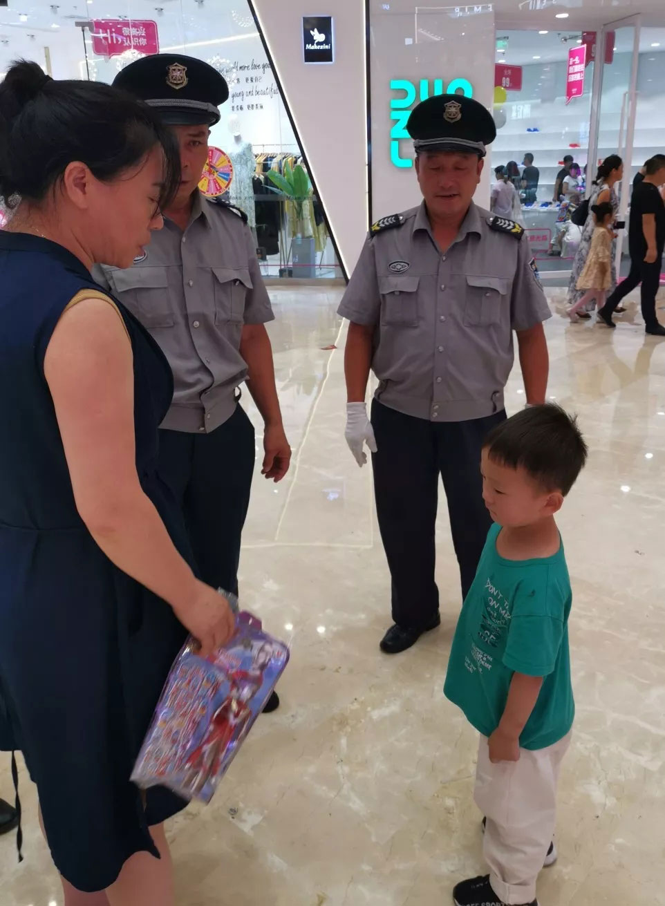 五大隊中隊長袁全在吾悅廣場四樓巡邏時,發現兩名兒童與家長走散,袁全立即向上級領導匯報,同時與商場工作人員一起幫助兒童找到家長,兒童家長對袁全的行為表示衷心感謝。