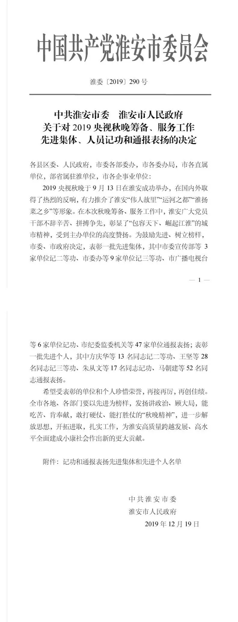 日前,淮安市委市政府發文對2019央視秋晚籌備和服務工作中涌現出來的先進集體和先進個人進行通報表揚,總公司獲先進集體,王廣衛同志獲先進個人,并被通報表揚。今年9月在淮安舉辦的央視中秋晚會,舉國關注,舉世矚目,淮安保安講政治、講大局,舉全公司之力,集全公司之智,眾志成城、戮力同心、創新舉措、壓實責任,自8月9日起至10月9日,從晚會設備進場、舞臺搭建、彩排聯排、錄播直播直至設備拆除,累計投入安保力量8000余人次,各類高科技安保裝備20余種,保障車輛580余輛次,圓滿完成了巡邏守護、安全檢查、科技保障、搜毒搜爆、無人機管控、后勤保障等系列任務,充分發揮了保安隊伍擔當勇為、攻堅克難、敢打必勝的拼搏精神,確保了央視秋晚的成功舉辦,得到了央視導演組、組委會的充分肯定和市委市政府的高度好評,企業品牌形象得到了進一步提升!