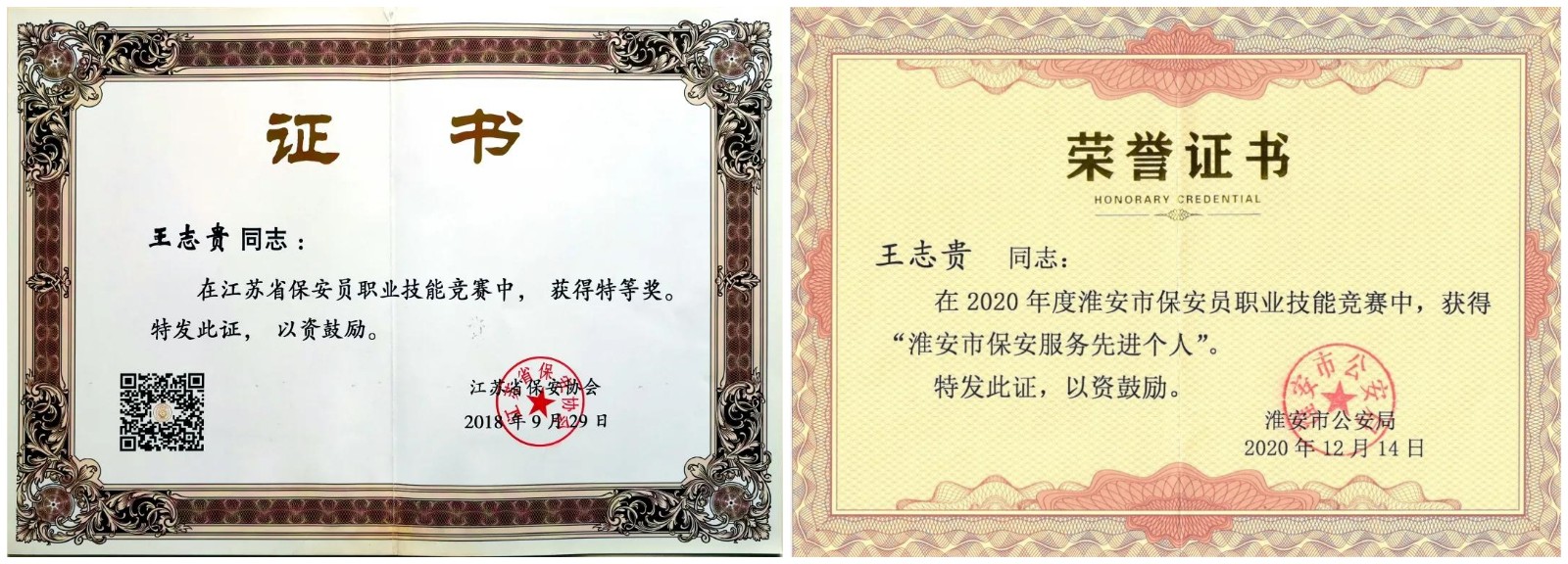 押運車長王志貴同志,本科學歷,中共黨員,保安員國家職業技能等級二級,保安技師資格證。工作十幾年來,他始終保持軍人本色,服從命令,聽從指揮,愛崗敬業,不斷挖掘自己的內在潛能,多次參加省、市保安職業技能大賽,先后榮獲省、市數次獎項:2018年度,在江蘇省保安職業技能競賽中,獲得“特等獎”,被授予“江蘇省技術能手稱號”,被總公司評為“十佳保安”;2019年度,被總公司評為“優秀車長”、“押運紅旗車組”;2020年度,被授予“江蘇省技術能手”、“江蘇省五一創新能手”、“江蘇省青年崗位能手”、“淮安市青年崗位能手”、“淮安市技術能手”、“淮安市五一創新能手” 等榮譽稱號,被淮安市公安局評為“淮安市保安服務先進個人”。