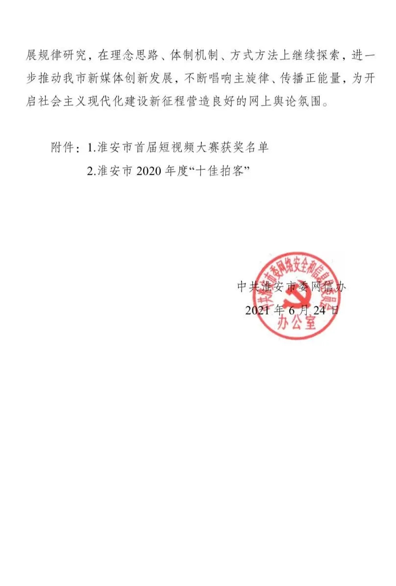 為宣傳貫徹落實習近平新時代中國特色社會主義思想,大力弘揚社會主義核心價值觀,聚焦展示淮安高水平全面建成小康社會進程中取得的重大成就,彰顯淮安建設“綠色高地 樞紐新城”的精彩風貌,推動全市網絡傳播力提升,淮安市委網信辦于 2020 年11 月組織開展了淮安市首屆短視頻大賽評選活動。本次評選分為競賽單元“美麗淮安 幸福家園”和特別競賽單元“暖心淮”、“抗疫故事”。經組織申報、初步評選、綜合評審,全市共有68 件作品獲得一、二、三等獎及優秀獎。