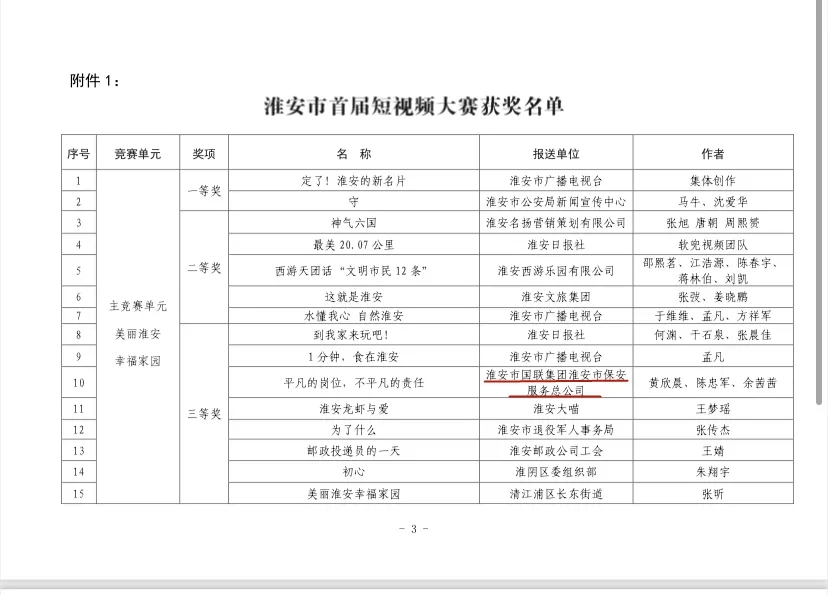 近日,在淮安市委網信辦組織開展的“淮安市首屆短視頻大賽評選活動”中,國聯保安總公司報送的短視頻作品《平凡的崗位 不平凡的責任》,榮獲“美麗淮安 幸福家園”競賽單元三等獎。